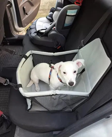 "OMG, luv this pet car seat! My lil pup stays super safe while I'm driving. No more jumping around and I feel so much more focused on the road. Easy to hook up and fold away. Can't imagine road trips without it now😊👍"